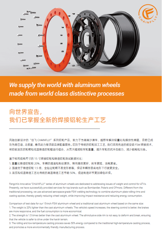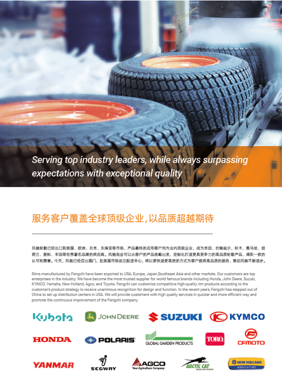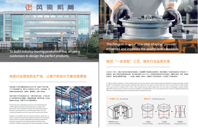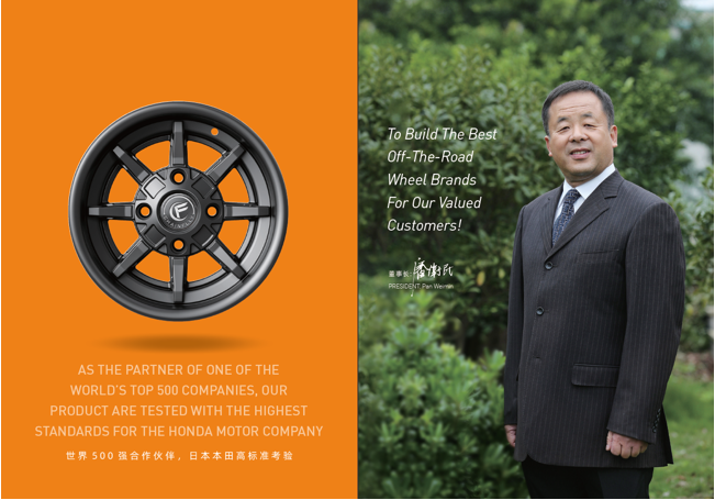 浙江風(fēng)馳機(jī)械有限公司,成立于1994年,伴隨著時間的飛逝,一直以工匠精神專注生產(chǎn)非公路低速車輛輪轂,在董事長潘衛(wèi)民的英明帶領(lǐng)下,風(fēng)馳以自信、沉穩(wěn)、堅實(shí)的腳步,企業(yè)逐步成為了世界500強(qiáng)合作伙伴、申請了企業(yè)獨(dú)有的輪輞品牌、創(chuàng)立了旗下5家子公司、獨(dú)創(chuàng)特殊工藝、產(chǎn)品革新?lián)Q代,一直以實(shí)現(xiàn)“引領(lǐng)低速車輪發(fā)展,為中國制造正名”的使命及成為“全球知名低速車輛制造企業(yè)的最佳戰(zhàn)略合作伙伴”為愿景而一直努力著。
