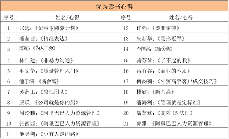 本次為第四季度讀書心得評選活動,經總裁辦校對、審核,從100多篇心得中初選出35篇,再根據主題明確、立意新穎、結合工作實際、文字通順完整等篩選出22篇優秀心得,其中獲得本季度“最佳讀書心得”得主是生產部蔡云峰《不清單革命》。其余優秀文稿如下: